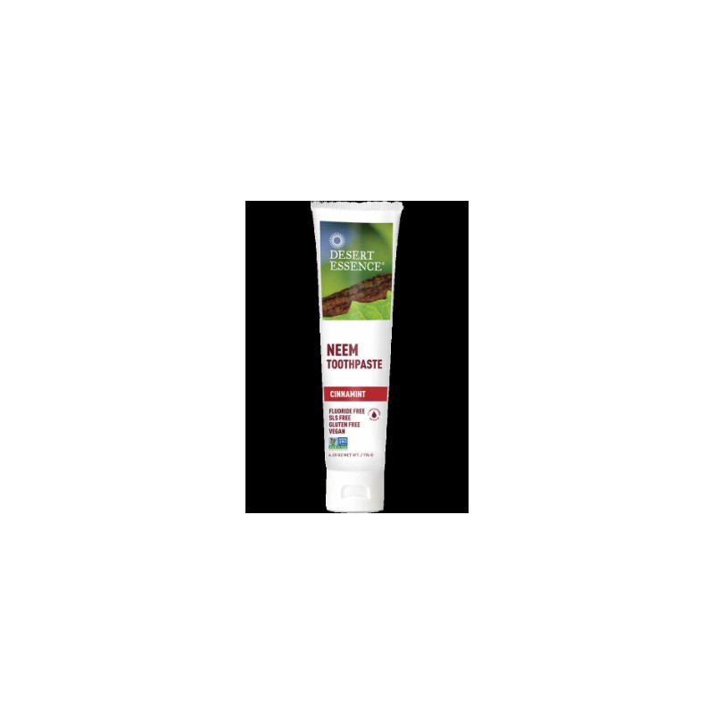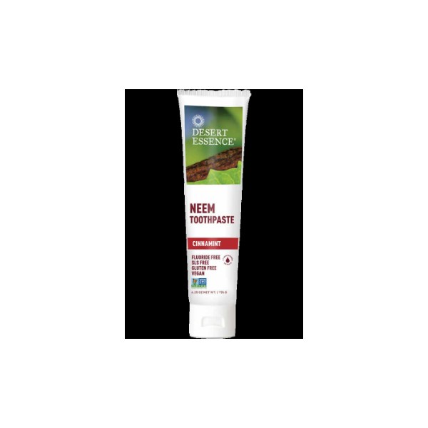 The bold flavour of Cinnamint paired with Ayurvedic Neem and Australian Tea Tree Oil Desert Essence Neem Cinnamint fluoride-free Toothpaste keep your mouth healthy and your smile bright. Harnessing ancient botanical wisdom, this fluoride-free toothpaste helps support a healthy mouth. Neem – the Ayurvedic “toothbrush” – helps to neutralize bacteria, helping to remove impurities, while Baking Soda, Sea Salt, Zinc Citrate and Australian Tea Tree Oil provides powerful defense actions against plaque, bacteria and cavity-forming sugar acids. Neem Cinnamint fluoride-free Toothpaste from Desert Essence is infused with a bold, spicy Cinnamint flavour to leave breath as fresh as can be. [TOOTHPASTE]