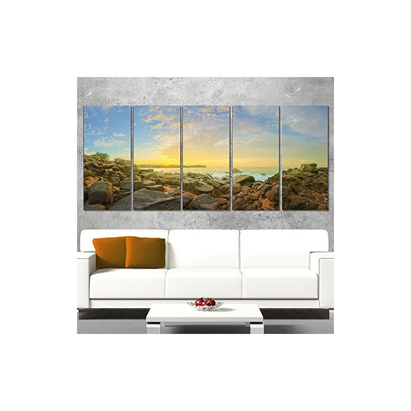 Design Art Rocky Untouched Romantic Large Seashore Canvas Print-60x28 5 Piece-PT9972-401, 60x28-5 Equal Panels