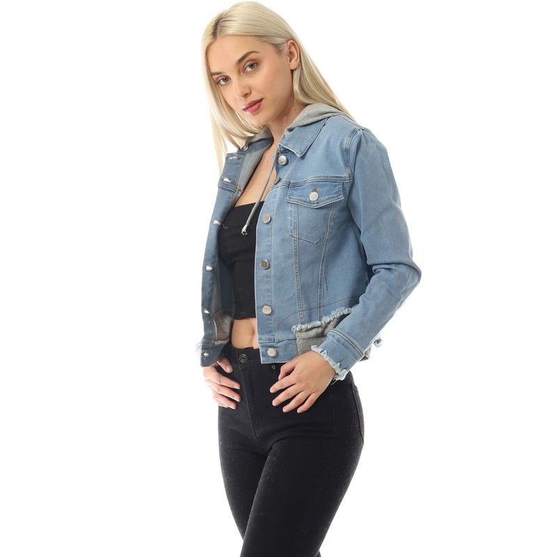 - Características: cuerpo de mezclilla, dobladillo sin procesar, bolsillos en el pecho, sin bolsillos laterales, mangas y capucha de jersey, capucha desmontable con cordón ajustable, material súper elástico.