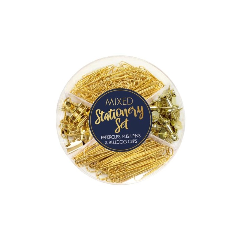 Design Group Mixed Stationery Set - Paperclips, Push Pins & Bulldog Clips - Gold - 1 Set