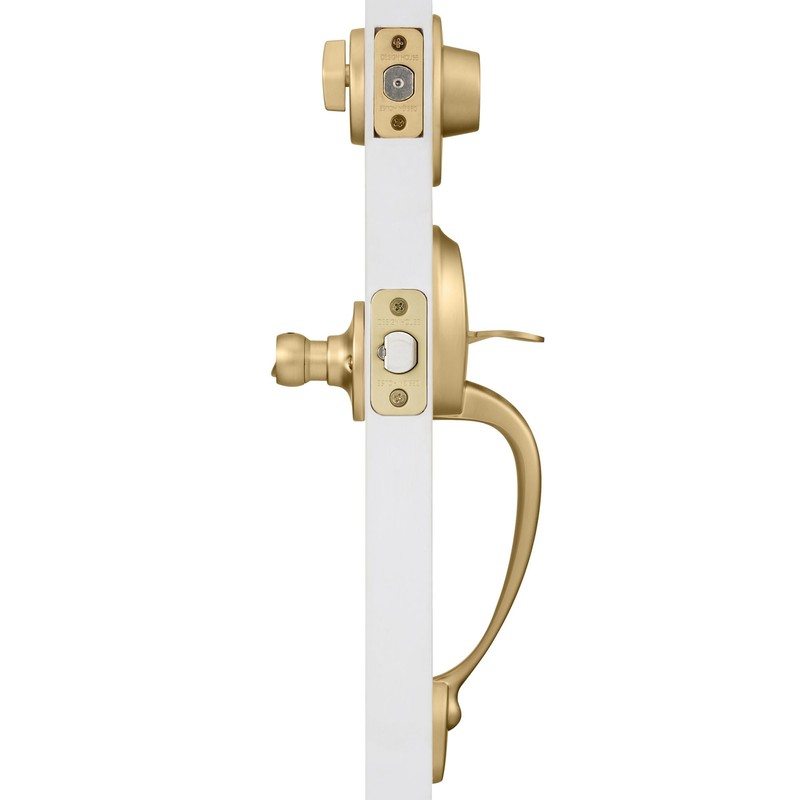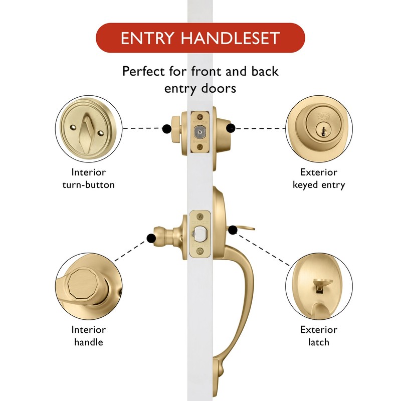 • Coventry Entry Door Handleset: Features a single cylinder deadbolt with keyed lock exterior and turn-button lock interior, a vertical handle for outside the door and low-profile wave lever for inside
