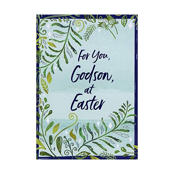 Designer Greetings Green and Silver Foil Vines on Light Blue : Dark Blue Border Godson Easter Card