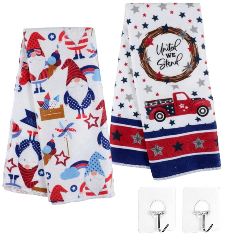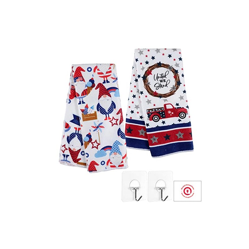 - You will receive; 2 Hand towels, one with gnomes wearing the American flag and one with a vintage pickup truck with American flags and a wreath that says " United we stand". 2 Heavy Duty Self Adhesive Hook from "Muchai Innovations".
