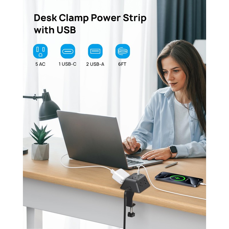 • Desk Clamp Power Strip: The 5 AC outlets are spaced well apart, cleverly arranged on three sides, facing outwards, which makes the surge protector power strip fit multiple bulky power adapters and helps those bulky plugs sit properly and not dislodge. This desk power strip is mountable, The clamp fits desktops ranging from a maximum of 2.5" thick.
