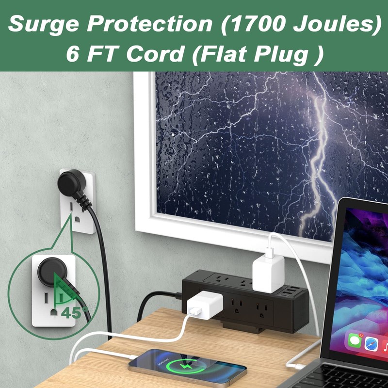 - 【WIDELY SPACED DESK OUTLET】: 9 well-spaced AC Outlets (1.38 inch ), enough to handle most adapters, to provide adequate power for most charging situations,6 FT Cord (Flat Plug ) is long enough to reach where needed. 1700 Joules surge protector to ensure the safety of your electronics.