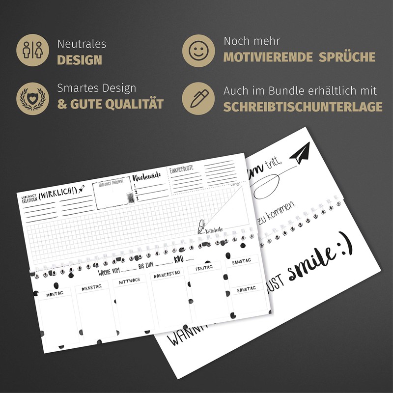 - Organised – Desk calendar for planning and order on the desk. Plan your week with goals and track your habits. Ideal for planning and organising in the office, in the home office or at home.