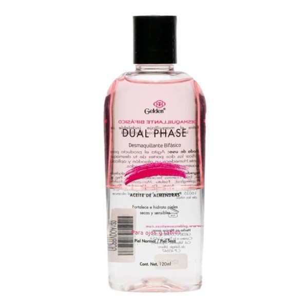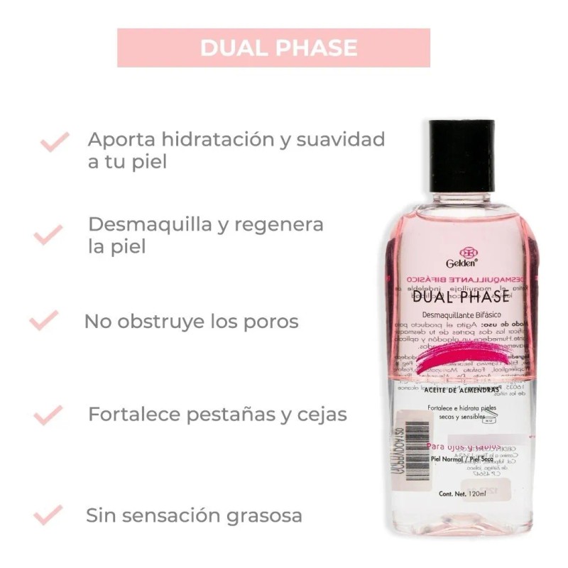Desmaquillante bifásico que retira y elimina restos de maquillaje de ojos y labios con facilidad. Su fórmula con aceite de almendras calma la piel y la mantiene hidratada. Contiene antioxidantes que previenen el envejecimiento prematuro de las células. Dual Phase deja un efecto aterciopelado y de suavidad en la piel sin sensación oleosa. Apto para todo tipo de piel incluso piel sensible.