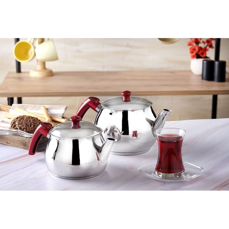 - Turkish Teapot Set: Samovar style teapot set with self strainer is made from top-quality 18/10 Stainless Steel. It has ergonomic and heat insulated plastic red handles that allow for a comfortable grip while holding the pot. It is suitable for Turkish tea, green tea, herbal tea, blooming and loose leaf tea. It is a home décor item for your kitchen to give vintage style and retro look.