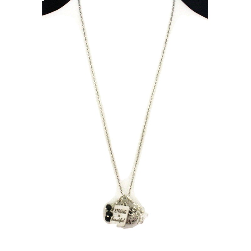 • 4 charms on this necklace total- clear tassel, black tassel, aromatherapy diffuser, and "Strong is Beautiful" dangle.