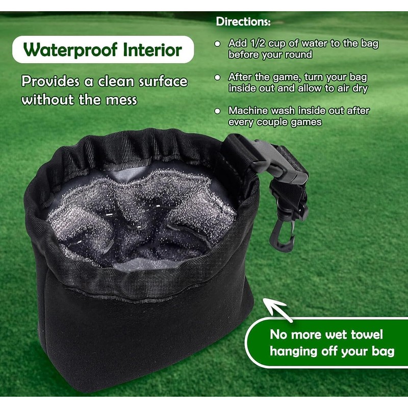 - WATERPROOF DESIGN - Holds enough water for an entire round of golf; the interior features a gentle scrubbing material that avoids surface scratches, preserving the quality of your clubs and balls.