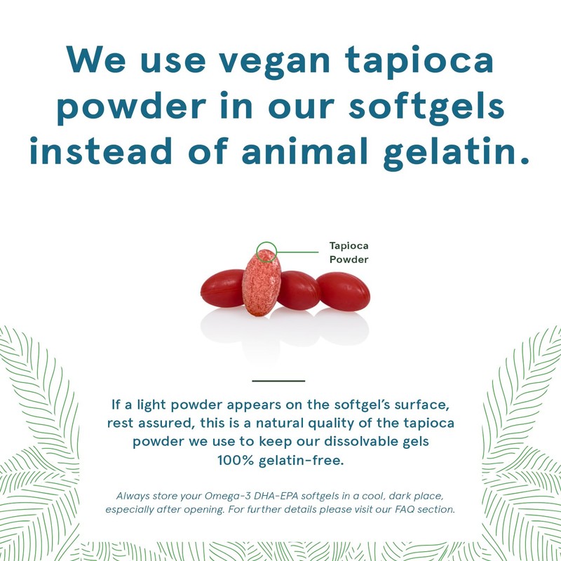 - NON-FISH SOFTGEL: This algae omega does not have a fishy taste. DEVA Vegan DHA & EPA oil is encapsulated in non-animal vegan softgels, and it is carrageenan-free. There is no gelatin or other animal-derived ingredients.