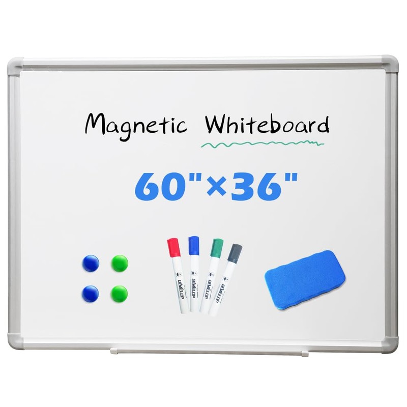 DEVELOP Large Magnetic Dry Erase Board, 60" X 36", Hanging Whiteboard for Home Office School Supplies, Silver Aluminium Frame with Detachable Marker Tray, 4 Markers, 1 Eraser and 4 Magnets