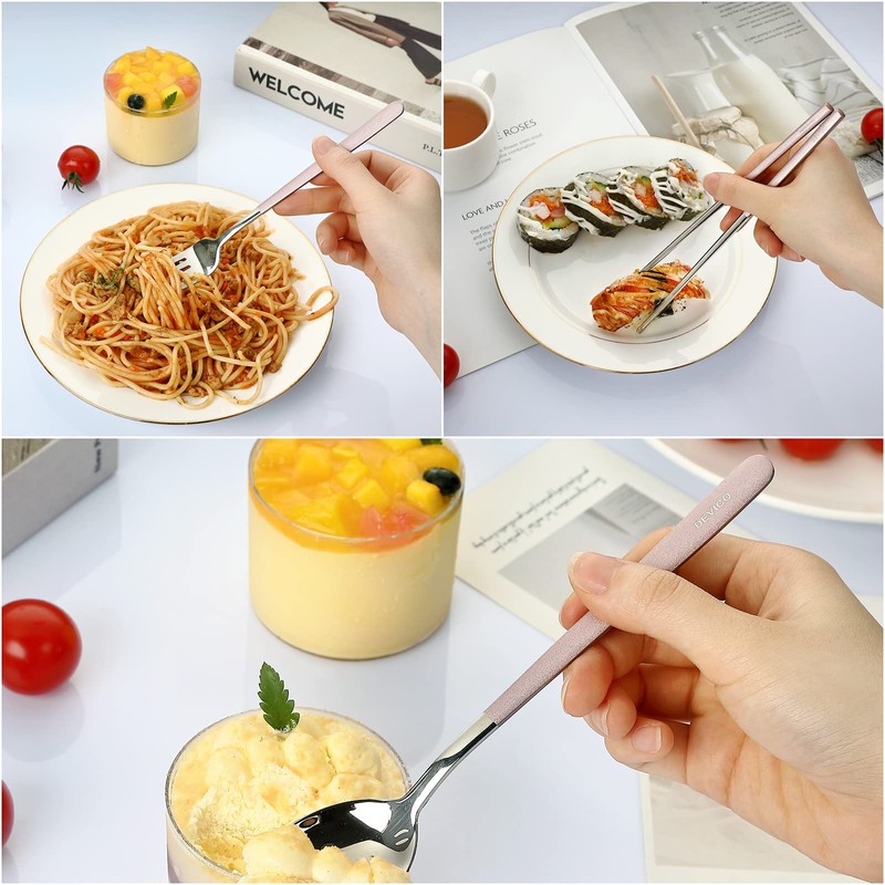 - MULTIPLE USE SCENARIOUS: This reusable utensils set with case contains 1*spoon, 1*fork, 1 pair chopsticks & 1*utensils case. You can carry this lunch utensils set for work, or as your camping utensils. This utensil sets for lunch can also be as your daily lunch utensil set, or be taken to school, dorm, restaurant, picnic