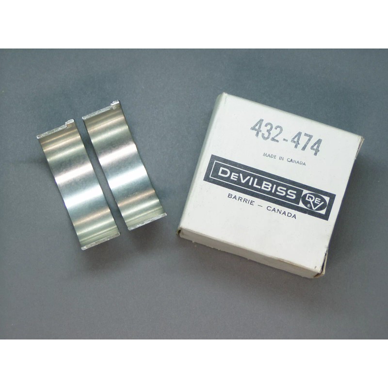 NEW old stock. Devilbiss/Devair replacement part #432-474 connecting rod bearing insert kit. Standard size. Two matching pieces per kit. Installs in connecting rod of model Devilbiss 432 four cylinder air compressor pump (4 kits required per pump) also Devilbiss/Devair model 44642 two cylinder air compressor pump (2 kits required per pump). Each piece stamped 5-79 432-22 CLEVITE. Original Devilbiss part. The Devilbiss Company Toledo, Ohio & Barrie Canada.
