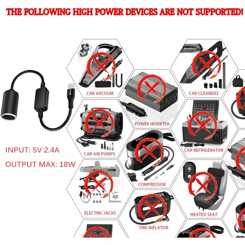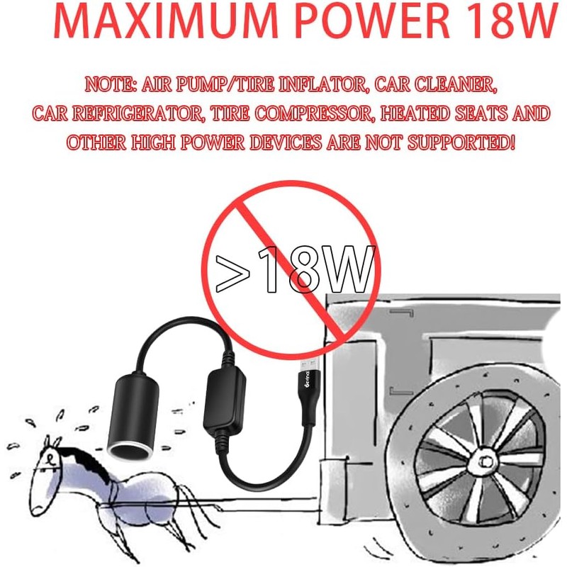 Note: Not suitable for devices over 18W, such as car air pumps, vacuums, power inverters, tire inflators, compressors, and other high-power equipment.
