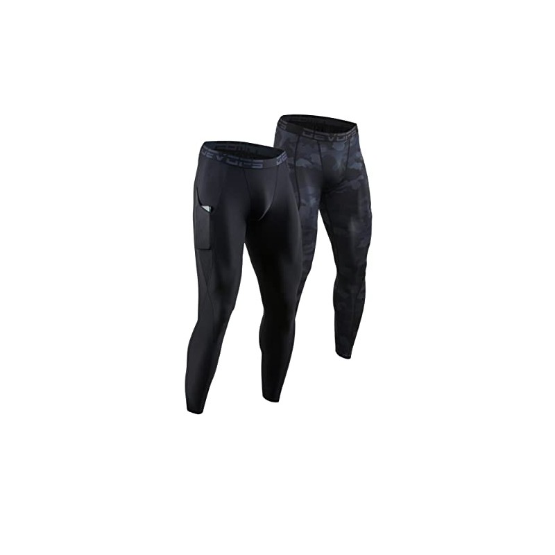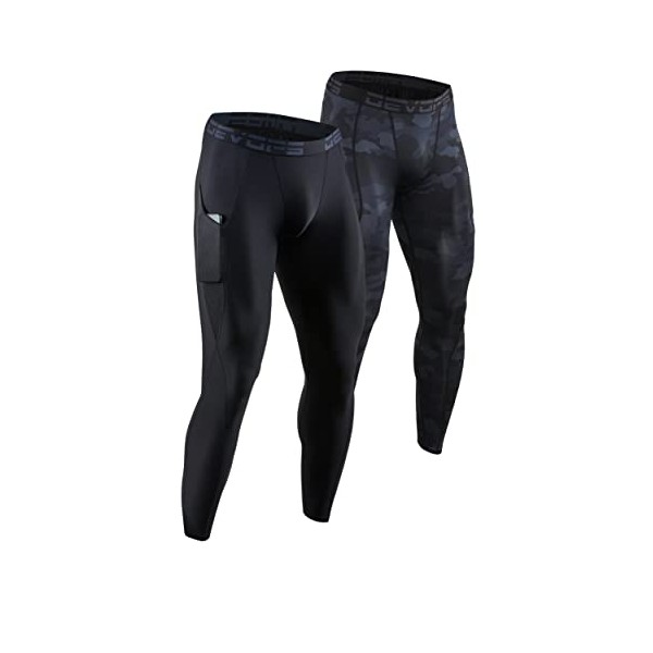 DEVOPS 2 Pack Men's Compression Pants Athletic Leggings with Pocket (Large, Black/Camo Black)