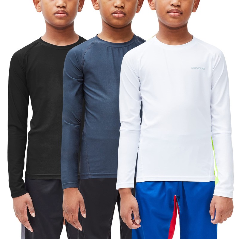 DEVOPS Youth Boys 3-Pack Compression Athletic Performance Baselayer Long Sleeve Shirts (Small, Black/White/Charcoal)