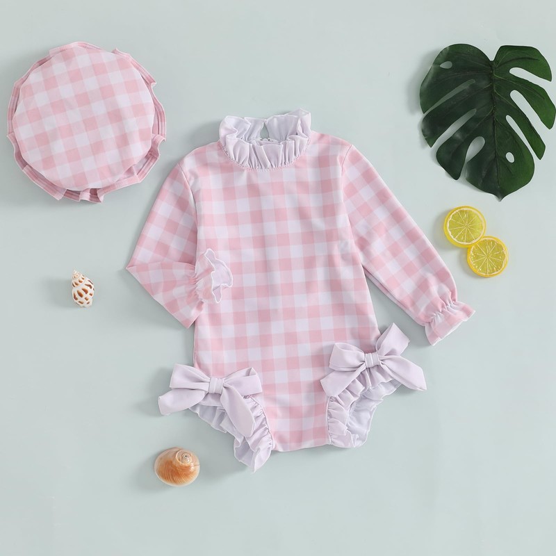 - Features: Baby girl rash guard swimsuit, swimsuit for girls toddler, long sleeve swimsuit girls, toddler bathing suit girl, toddler baby girl one piece swimsuit long sleeve plaid print bathing suit beach swimwear, baby girl checkered swimsuit, kids girl swimsuit; Plaid print, ruffled mock neck, long sleeve and bow decor design; The back zipper design of the girl swimwear is easy to put on and take off, with a slim fit that perfectly fits the child's body