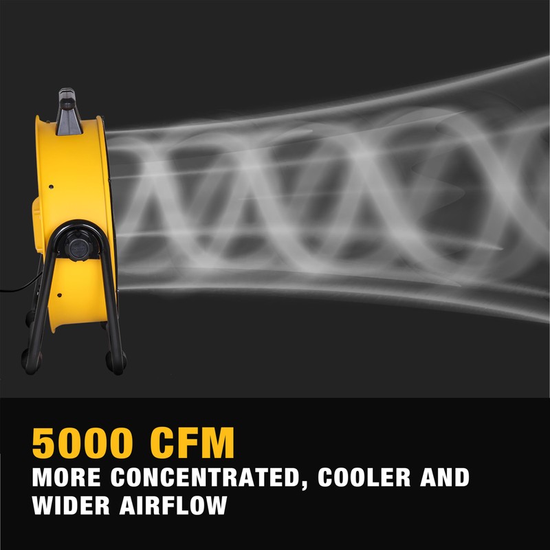 - 3 SPEED SETTINGDEWALT powerful fan features 3 speeds for customized airflow and runs at 5000 CFM and 1400 RPM(Max). With low, medium, and high volume options, you have the flexibility to choose the airflow and optimize air circulation in your workplace.