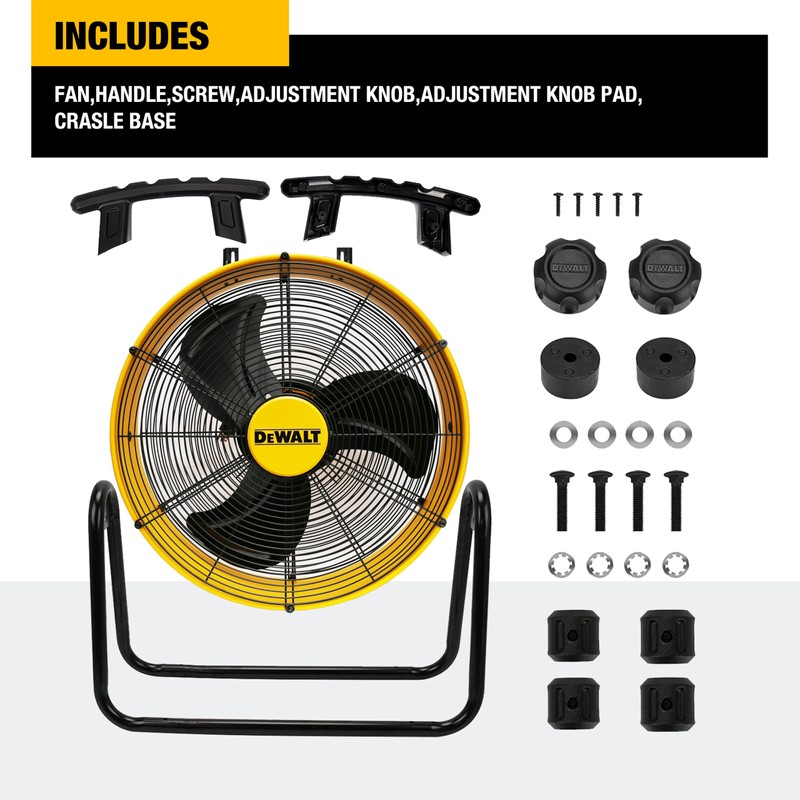 - STABLE & RELIABLE DESIGNDEWALT hurricane fan use durable metal construction, rubber pads, and sturdy aluminum blades that can withstand the rigors of daily use. Convenient carry handle for easy portability. The powerful motor provides overheating protection. 5 Year Limited Warranty.