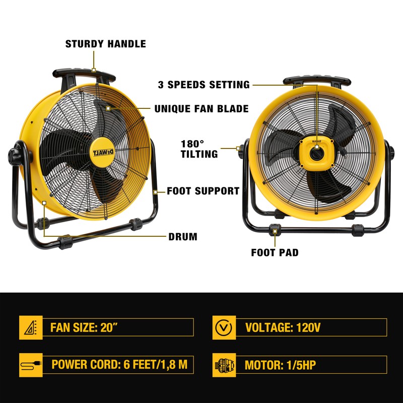 - UNIQUE TRUMPET-SHAPED DRUMDEWALT industrial floor fan with a trumpet-shaped design can generate a strong and steady airflow that can deliver lower temperature and create a comfortable environment.