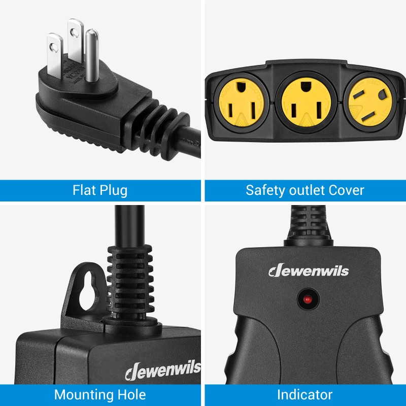 • 【 Waterproof construction 】 Outdoor power strip weatherproof made of durable PPO shell which resists abrasion, moisture, and exposure to sunlight; 6-inch SJTW 14/3C heavy gauge thick extension cord; twist-to-lock safety outlet cover provides protection from rain, snow, and dust