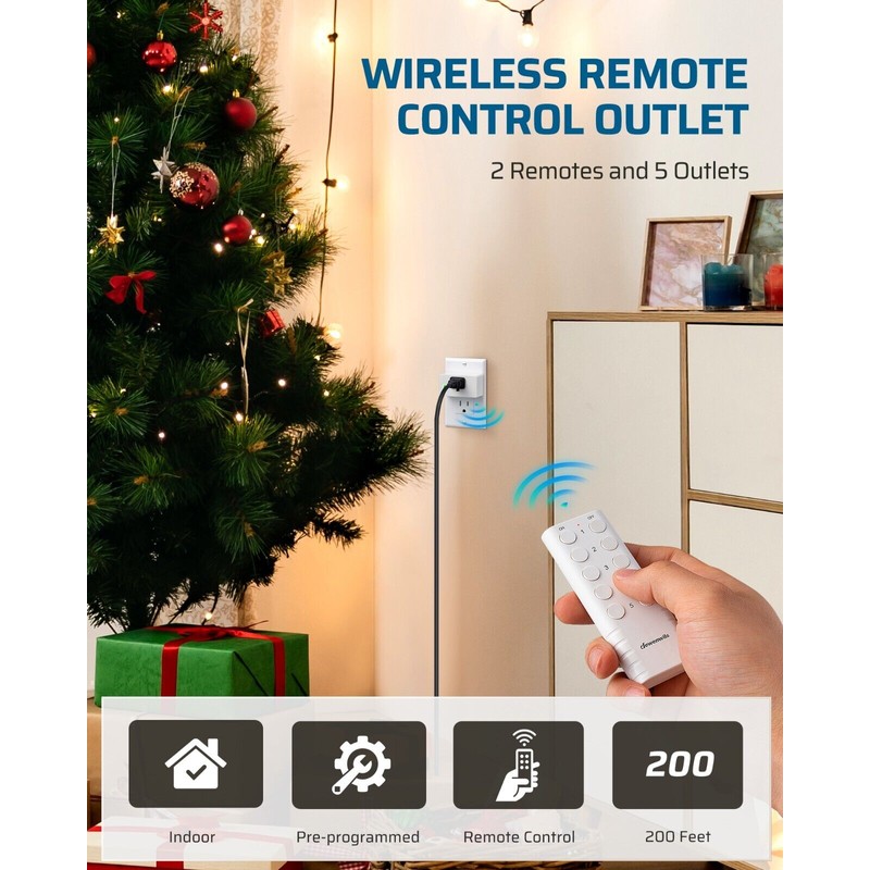 - [2 Remotes & 5 Outlets] 1 remote control can hold 5 different lights or devices; equipped with 2 remote controls, you can control the same plug from different places; programmable design ideal for Christmas tree, Christmas light, LED string light, holiday decoration, bedroom lamp, floor lamp, fan, heater, vacuum cleaner
