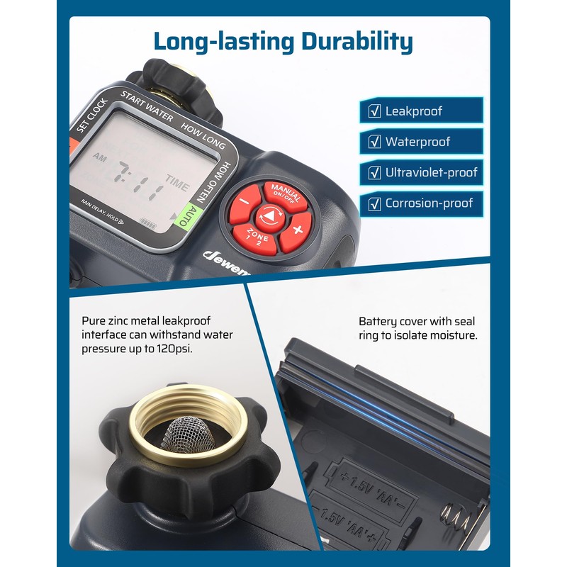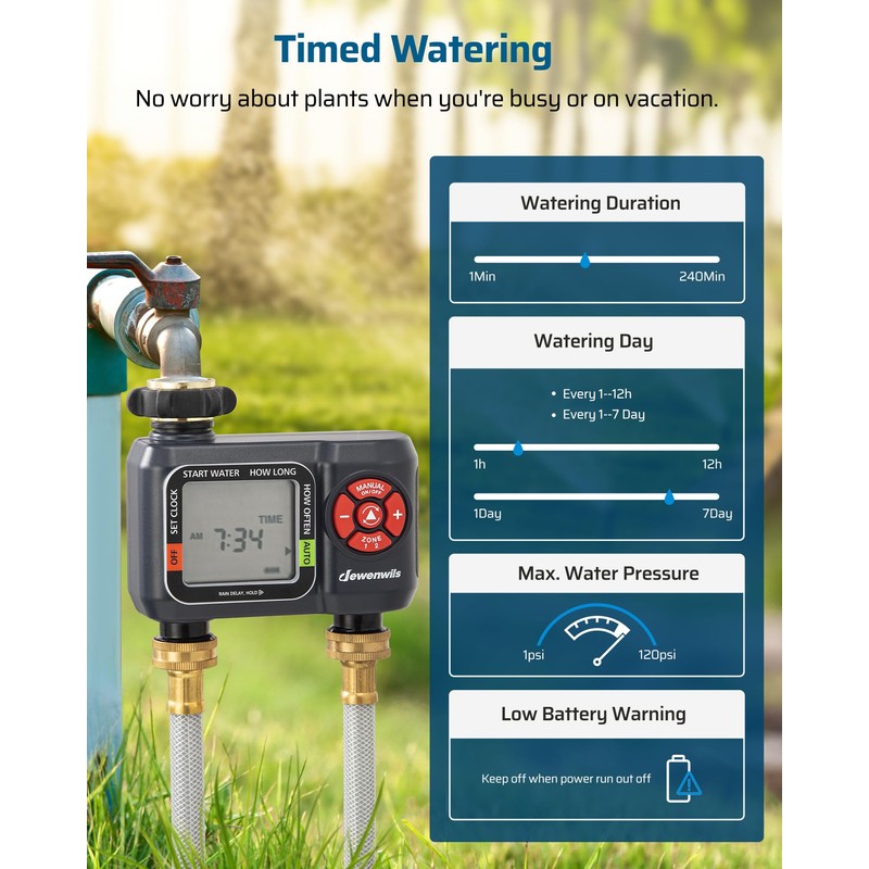 DEWENWILS 2-Zone Water Hose Timer – Programmable Sprinkler Timer with Rain Delay, Manual Watering & Auto Irrigation for Garden, Yard, or Lawn