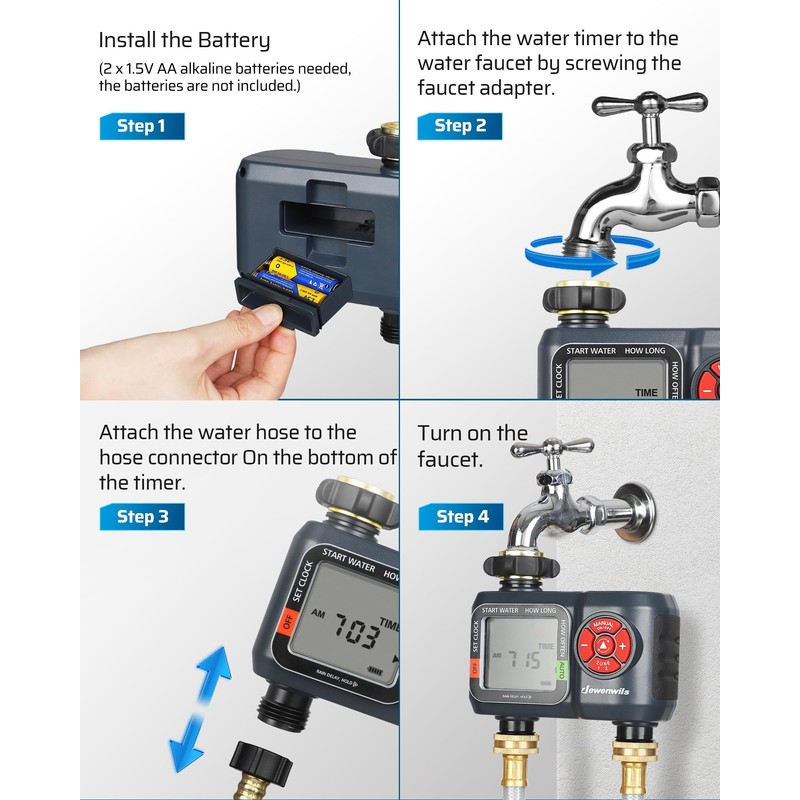 - [Easy to Program] This water timer for garden hose is easy to set, allowing for customized watering schedules (1-360mins) on any day or days of the week, or on a biweekly basis; cooperate with multiple water hose pipes to meet the weekly watering and irrigation requirements of an entire household
