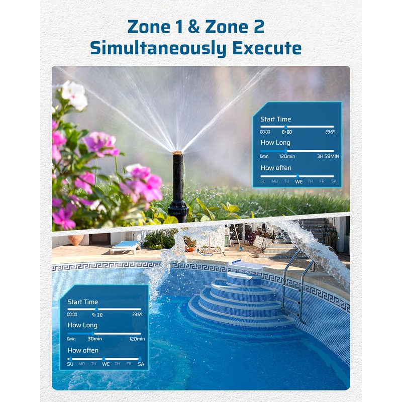 - [2 Independent Watering Zone] 2 zones (1 and 2) are controlled by different procedures via operate buttons to achieve different watering and do not interfere with each other; our 2 zone sprinkler timer is ideal for sprinkler/ lawn/ plant irrigation, water mist system, garden/ landscape watering; schedule your needs via different hose and settings in different days, save your energy