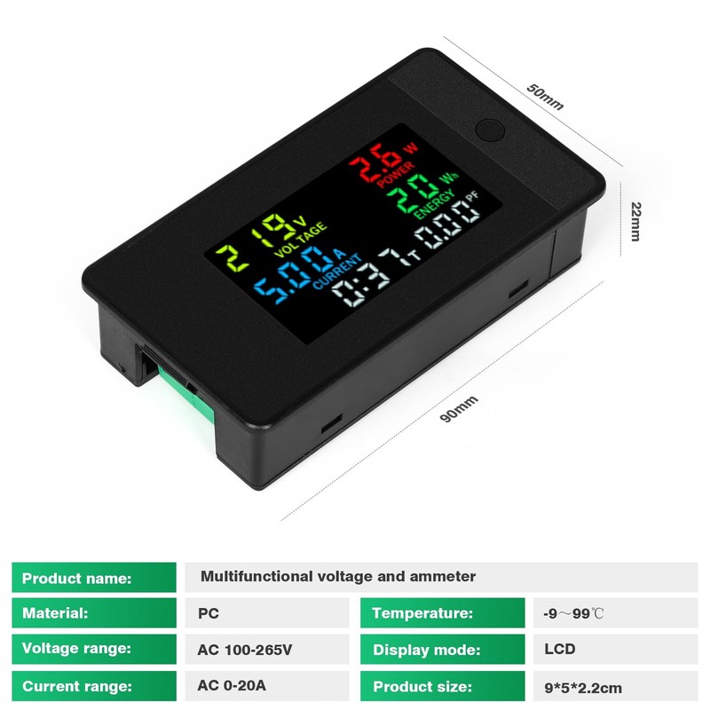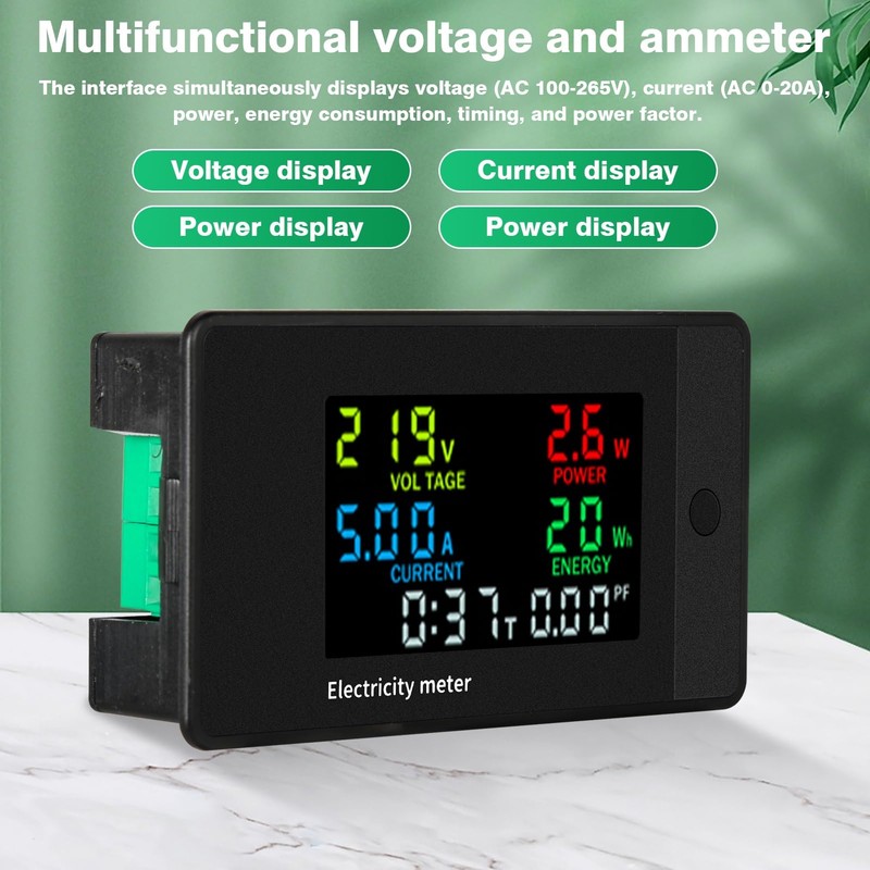 - 【Digital Electricity Meter】: One interface simultaneously displays voltage (AC 100-265V), current (0-20A), power, energy consumption, timing and power factor.