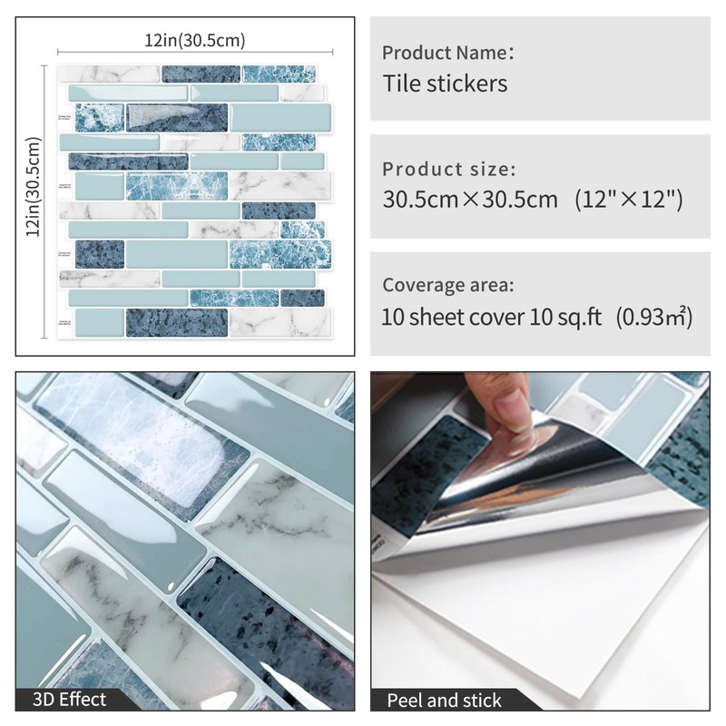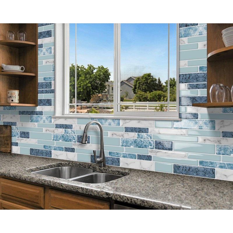 DEWOO Peel and Stick on Self Adhesive Backsplash Wall Marble Tiles Stickers 3D for Kitchen Bathroom,Spliced Blue (10-Sheet, 12"×12")