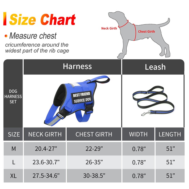 - EASY TO USE: This service dog vest set can quickly adjust the tightness of the neck strap and chest strap, and is equipped with a quick release buckle. All you need to do is put the dog harness around your puppy's neck, buckle it up, adjust the strap, and fasten the equipped dog leash to set off