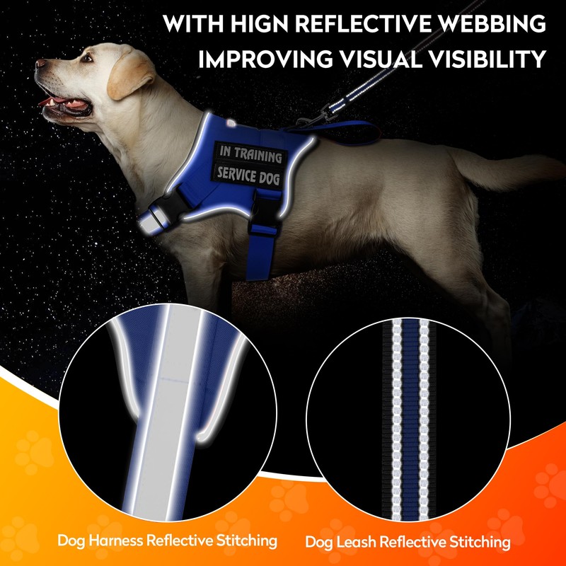 - COMFORT & SAFETY: The outer fabric of this service dog harness is made of 900D nylon cloth, which is sturdy and wear-resistant. The inner fabric is comfortable Oxford fabric, which improves air permeability and makes the dog feel comfortable and safe when wearing. The surface of the dog vest harness is integrated with high reflective webbing, improving visual visibility and making it safer for dogs to go out