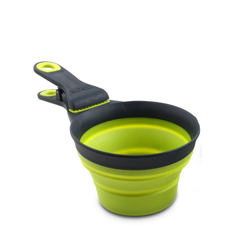 Proper portion control is key to a healthy diet for your dog or cat. One easy way to keep an eye on your pet's portion is to scoop dry pet food with a measuring cup. The KlipScoop by Dexas is three pet tools in one: a food scoop, a collapsible measuring cup, and a bag clip. To use, simply pop open the scoop portion and collapse for easy storage. Clips neatly onto your dog or cat food bag, sealing it for next use and always handy for the next feeding. Simple care- dishwasher safe!