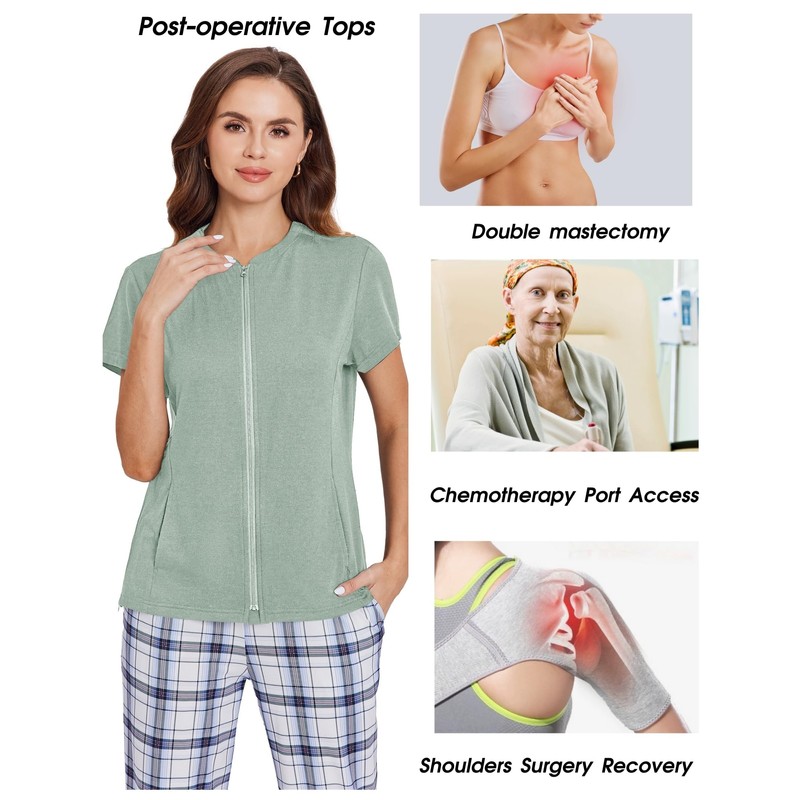 Deyeek Mastectomy Shirts with Drain Pockets Post Shoulder Surgery Tops for Women Chemo Port Short Sleeve with Zippers