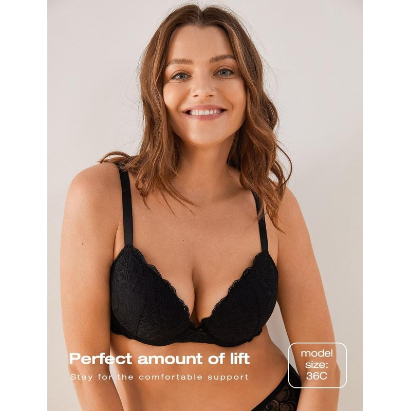 Deyllo Women's Push-Up Bra with Floral Lace Cups, Underwired Bra, Padded, Elegant, black