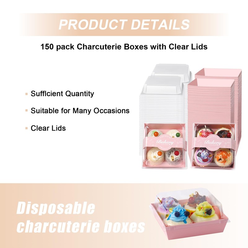 - 【What will you receive?】You will receive 150 pink square charcuterie boxes with lids, the size is 5.3x4.9x2.5 inches, the right size for a variety of baked goods, enough quantity for your daily use.