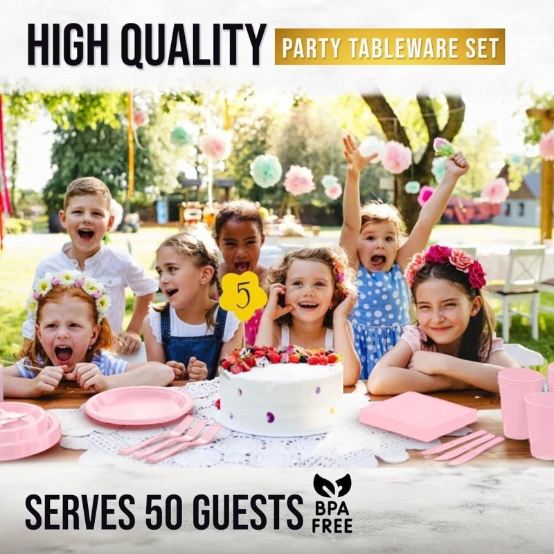 DFS 350 Pcs Pink Plastic Plates For Party, Disposable Dinnerware Set Serve 50 Guests