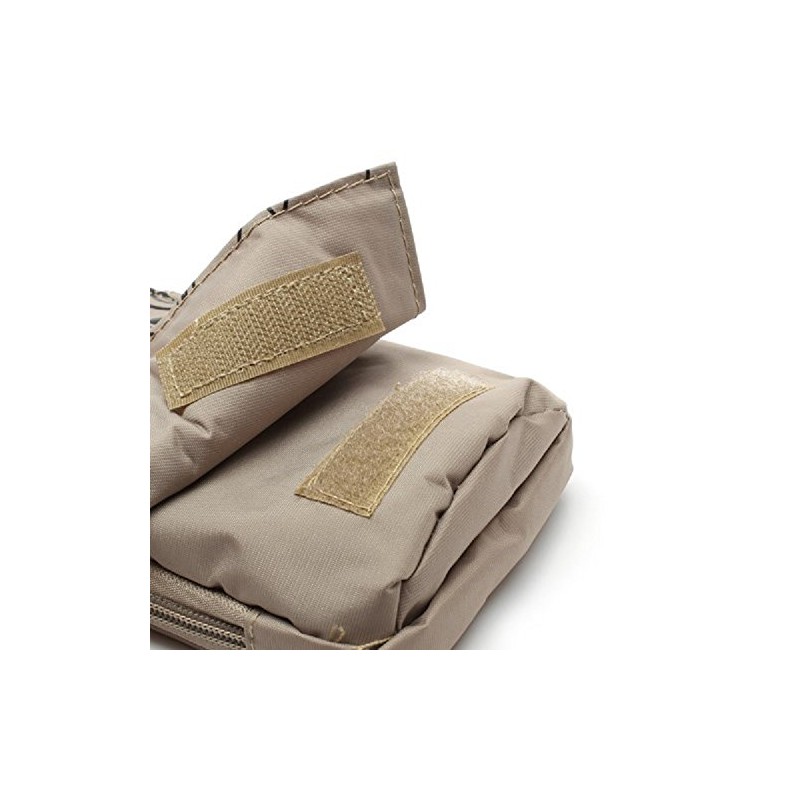 - Includes several compartments, one main zipper closed, and another closed front flap and velcro