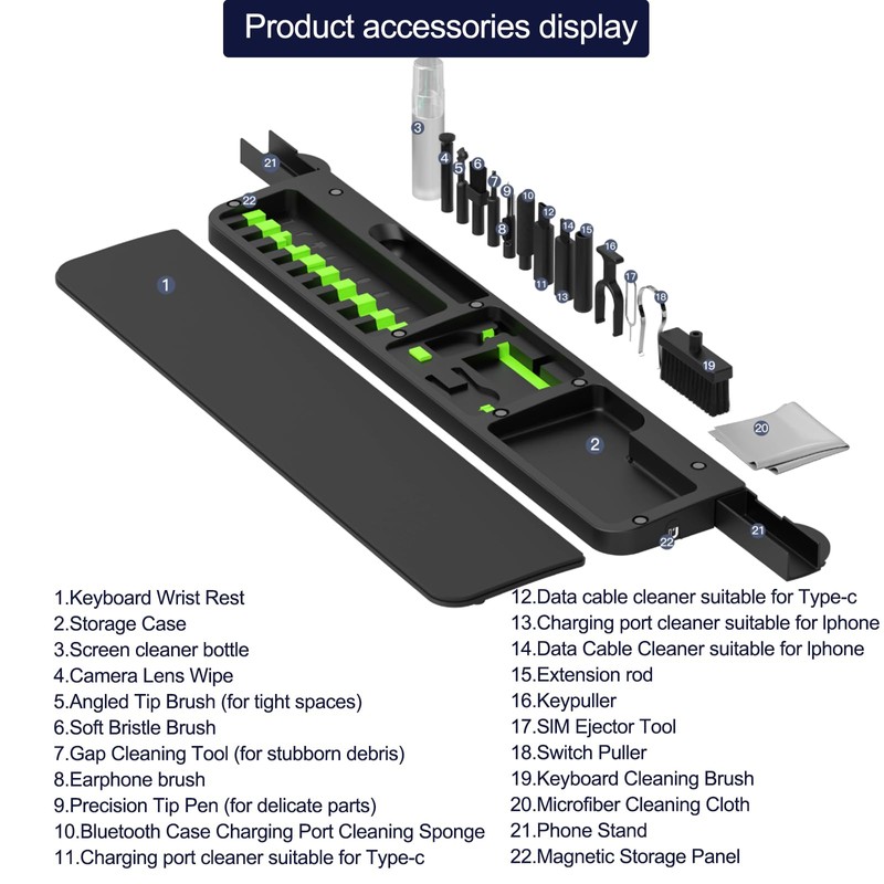 • All-in-One Organization: Laptop cleaning kit stores 22 tools in labeled slots(no more lost brushes). Including keyboard wrist guards, phone stands, magnetic storage panels, and most of the tools needed to clean various keyboards, phones, laptops, camera lenses, and screens.