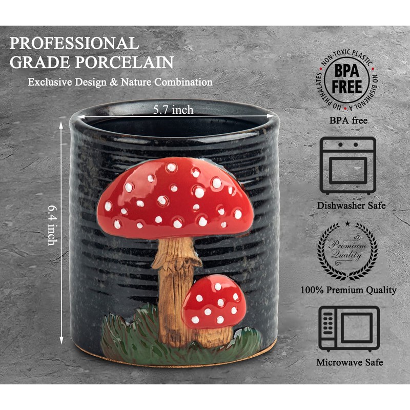 - 【Well Organized and Match Kitchen】The cute mushroom shapes and bright colors are easy to match with all kinds of kitchens and will make your kitchen feel natural all at once.In addition,the utensil holder is 5.6"X 5.6" X 6.4". Store all of your utensils in one place with this convenient ceramic holder. Never dig through a cluttered drawer to find your favorite spoon or spatula again.