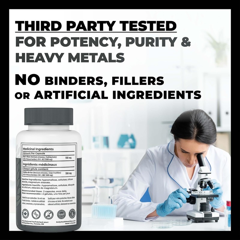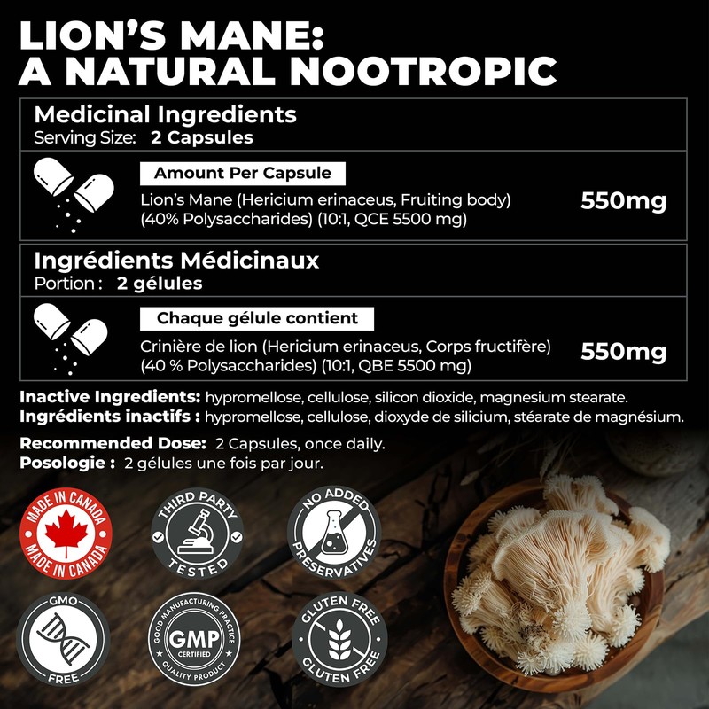 - Containing 160 Capsules of 100% Lion's Mane Mushroom Powder, our product is proudly made & assessed for purity & quality in Canada. It contains no fillers, binders, harmful chemicals & is free from GMOs, gluten & animal products. Canadian Natural Product Number: 80123148. Vegan Friendly.