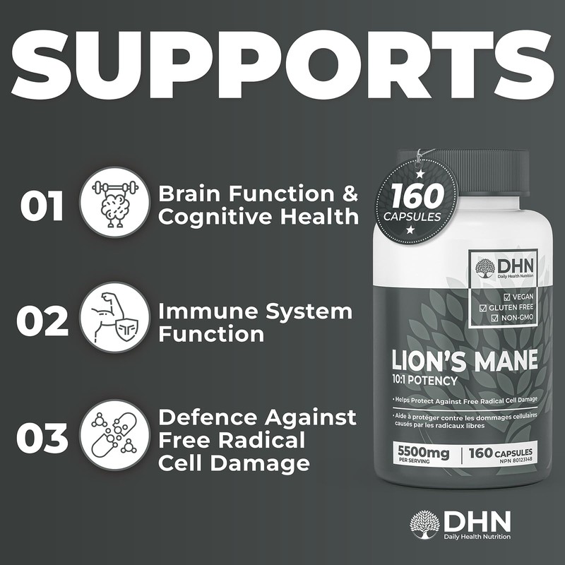 DH Nutrition *New Bonus Size* 160 Vegan Capsules of Premium Lion's Mane Mushroom Powder | Antioxidant & Immune Support | Natural Nootropic | 100% Fruiting Bodies | Canadian Made, Quality Assured