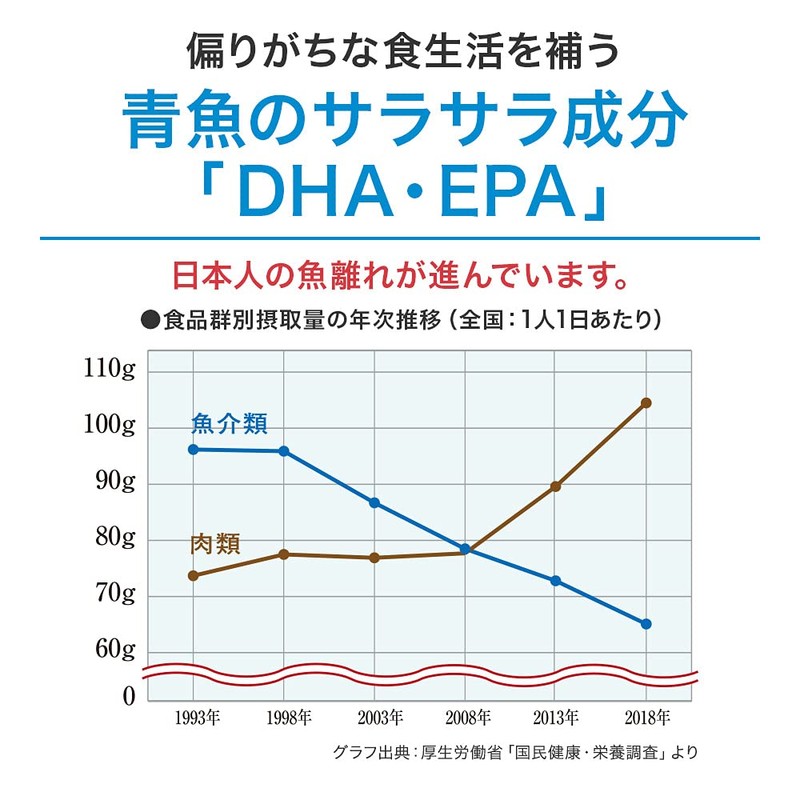 - 厚生労働省が摂取を推奨するDHA・EPAを1日で500mgも摂取できます。