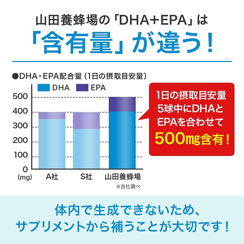 山田養蜂場のDHA+EPAなら、毎日の食事ではなかなか補えない大切な栄養成分を手軽に摂ることができます。5球で厚生労働省が推奨する摂取量の約4分の1に相当します。