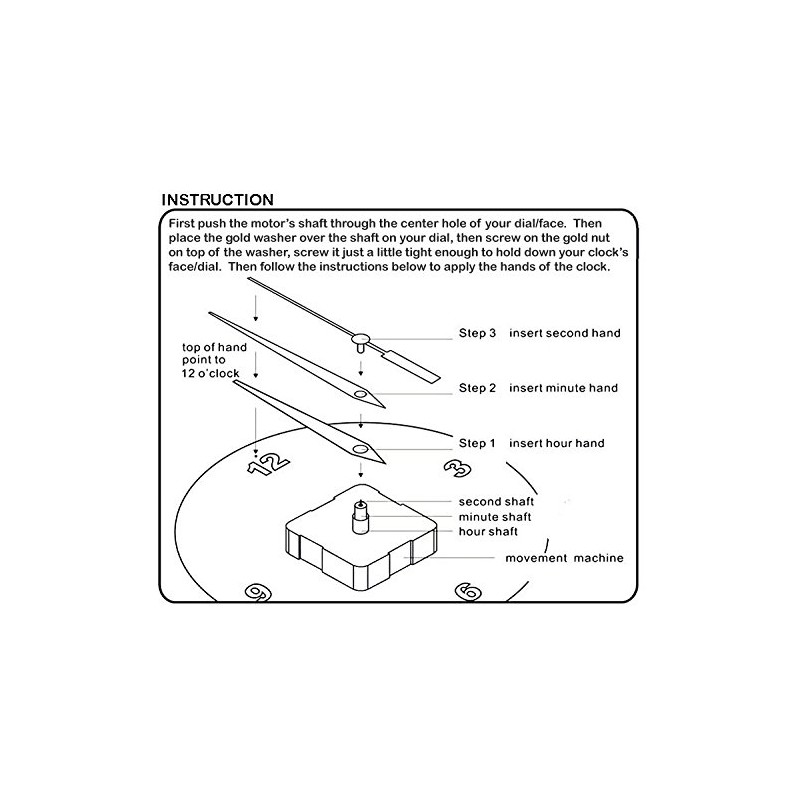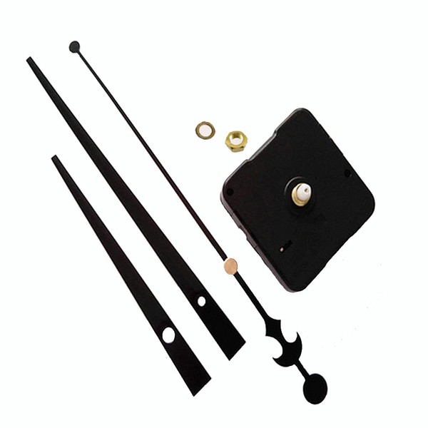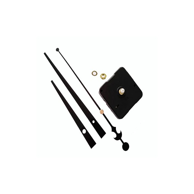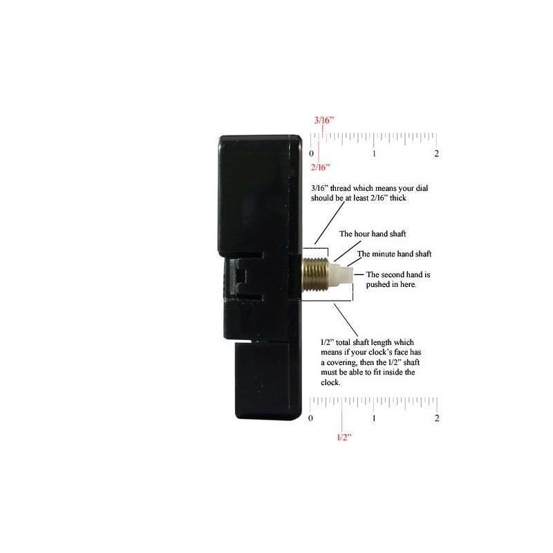 One Quartz Clock Movement/Motor kit #5168-S with a total shaft length of 1/2", and a threaded shaft of 3/16", therefore, we suggest that the thickness of your dial or clock's face cannot be more than 2/16" so there will be enough space to screw the nut unto the shaft to hold your dial/face in place. If you need a longer shaft then visit our other listings. This kit also includes black metal hour, minute and second hands that are longer than the average hands usually sold with this kit. The second hand has a gold center for a decorative touch. Also comes with an instruction sheet. Requires one AA battery to operate (not included). MINUTE HAND LENGTH: 6.38in (From the shaft hole) 5 1/2in. HOUR HAND LENGTH: 4.60in (From the shaft hole) 3 3/4in. SECOND HAND LENGTH: 7.67in (From the shaft hole) 5in.