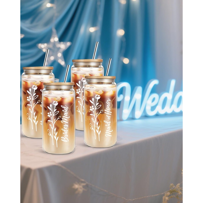 - Bridesmaid Proposal Gifts Set: Our bride cups for wedding are nice for your bridesmaids by your side on your big day; The package includes 4 pieces of glass cup with bamboo lids and stainless steel straw, so they are enough for all of your bridesmaids