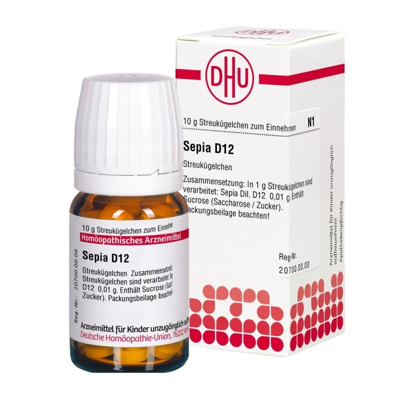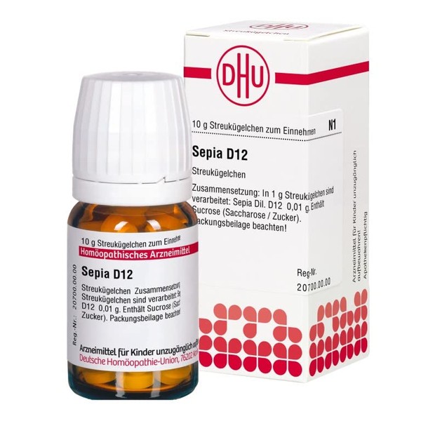 • DHU Sepia D12 globules, manufactured according to HAB (German Homeopathic Pharmacopoeia), in 10 g scatter balls, the active ingredient Sepia Dil. D12; other components: sucrose (sucrose)