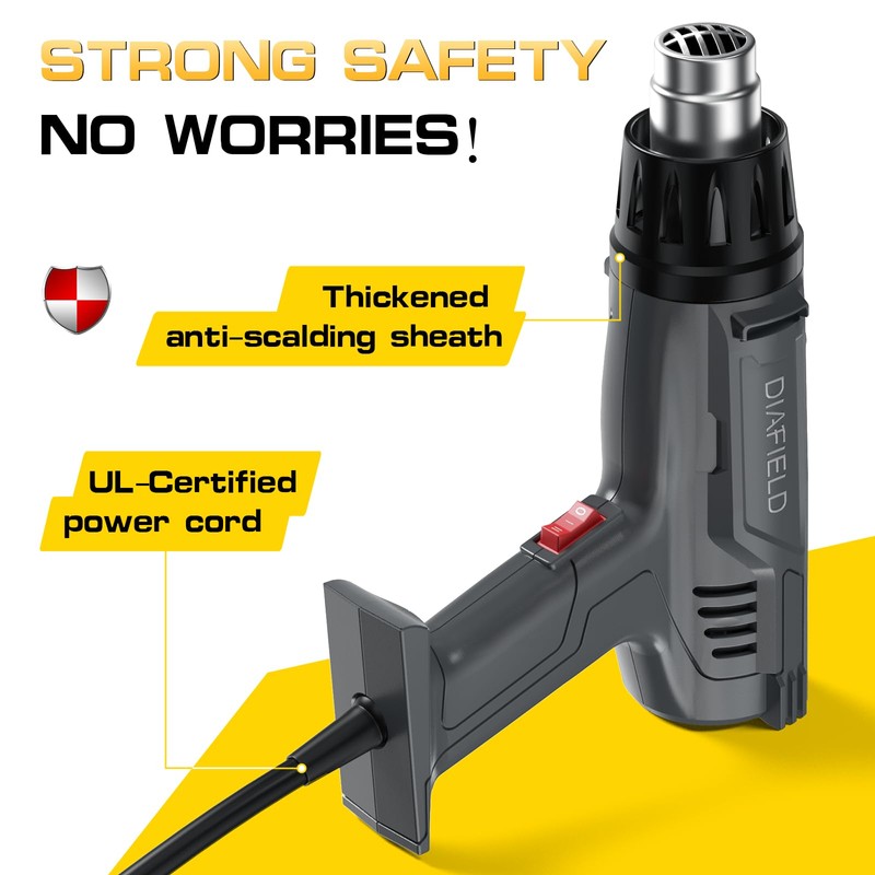 - [Comprehensive Protection] The built-in temperature control switch helps avoid overheating or damage to parts caused by hot air backflow. UL-certified wire and anti-scalding sheath ensure safe use. Our heat gun also possess an overload protector to avoid damaging the product and its circuitry. And it has been tested and approved by UL and ETL standard